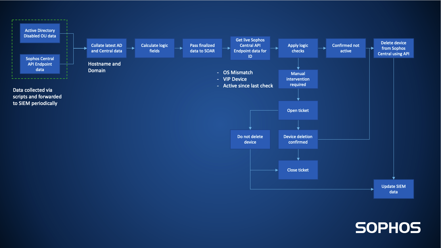 After comparing the machine last activity with the data from the SIEM and that obtained through the live Sophos Central API query, it’s calculated that the device has reported back into Sophos Central recently. These machines should be raised for manual validation before they are deleted.