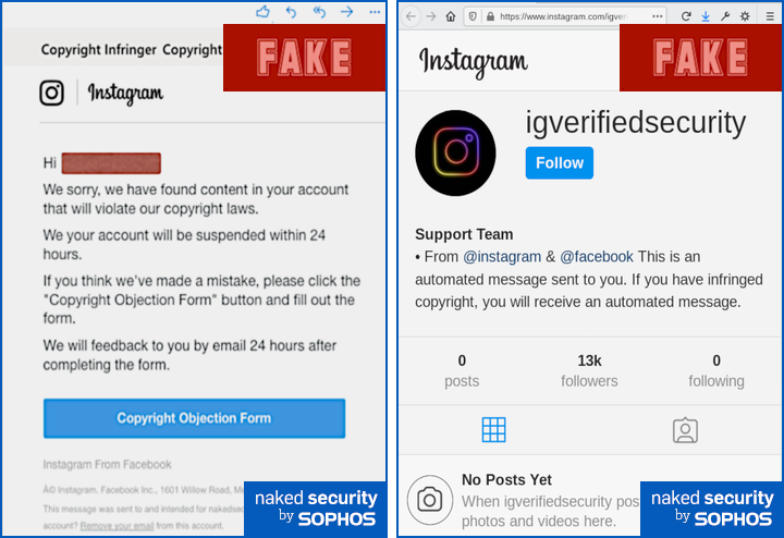 Left. Fake email “copyright warning’ pretending to be from Instagram.