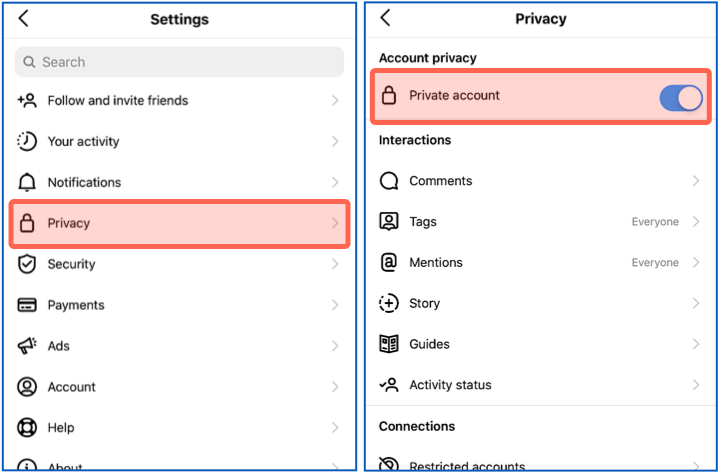 Left. Use ‘Privacy’ option on the Instagram Settings page to make your account private.