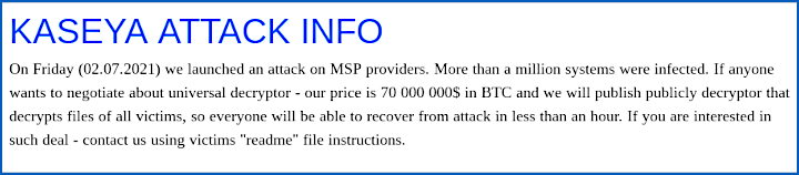 On Friday (02.07.2021) we launched an attack on [Managed Service Providers]. More than a million systems were infected. If anyone want to negotiate about universal decryptor – our price is [$70 million in Bitcoin] and we will publish publicly decrypto that decrypts all files of all victims, so everyone will be able to recover from attack in less that an hour. If you are interested in such deal – contact is using victims “readme” file instructions.