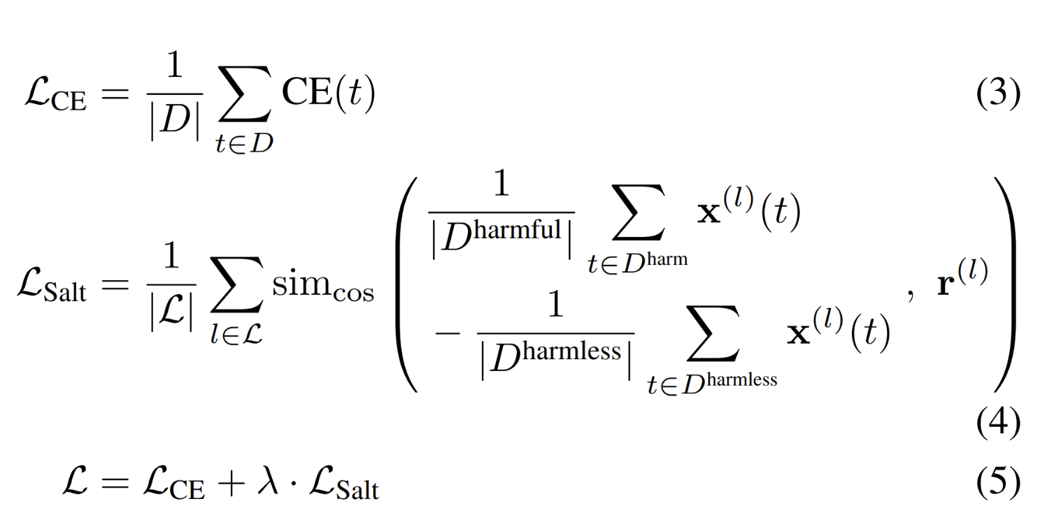 El segundo término introduce el objetivo de salado. Penaliza la alineación entre las activaciones internas del modelo y la dirección de rechazo precalculada r∗ en las indicaciones perjudiciales, lo que anima al modelo a «rechazar de forma diferente» y perturba los patrones de activación explotados por los jailbreaks.
