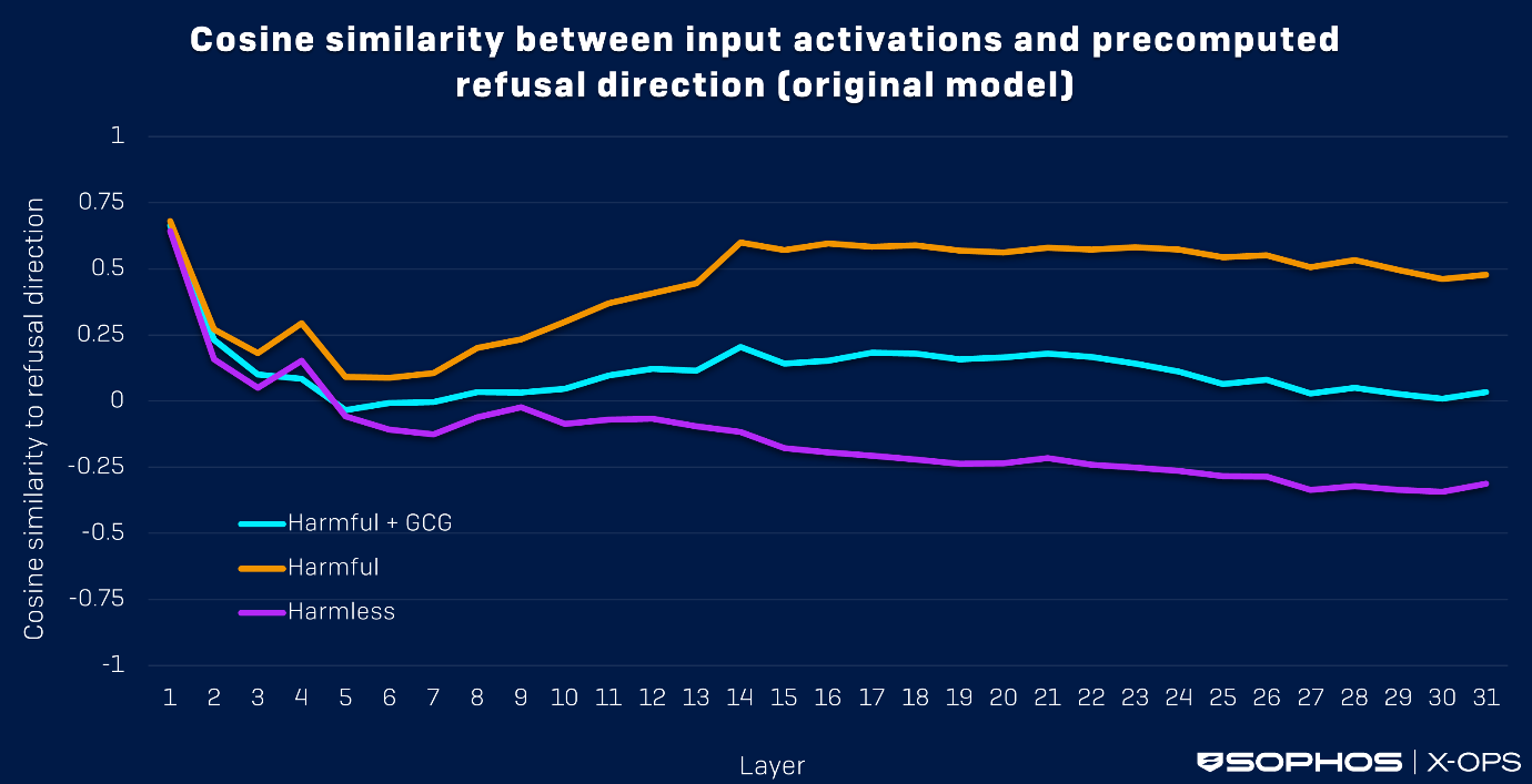 Para comprender cómo el salado interrumpe la transferibilidad del jailbreak, examinamos la similitud coseno entre las activaciones residuales y la dirección de rechazo precalculada en todas las capas, tal y como hicieron Arditi et al. En el modelo original, las indicaciones dañinas e inofensivas muestran una clara separación en su alineación con la dirección de rechazo: las entradas dañinas mantienen una alta similitud coseno positiva, mientras que las indicaciones inofensivas se alinean negativamente.