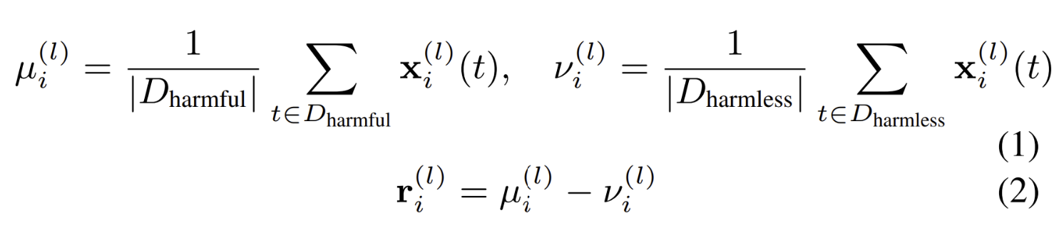 Siguiendo a Arditi et al., extraemos una dirección r en el espacio de activación que media las negativas del modelo. Adoptamos su enfoque de diferencia de medias, comparando las activaciones residuales tras instrucciones dañinas e inofensivas. Sea t ∈ D un token de entrenamiento con etiqueta yt y activación residual x(l)(t) en la capa l. Dividimos el conjunto de datos en Dharmful y Dharmless dependiendo de si la indicación tiene por objeto desencadenar una negativa. Para cada capa transformadora l y posición de token posterior a la instrucción i, calculamos, según Arditi et al:
