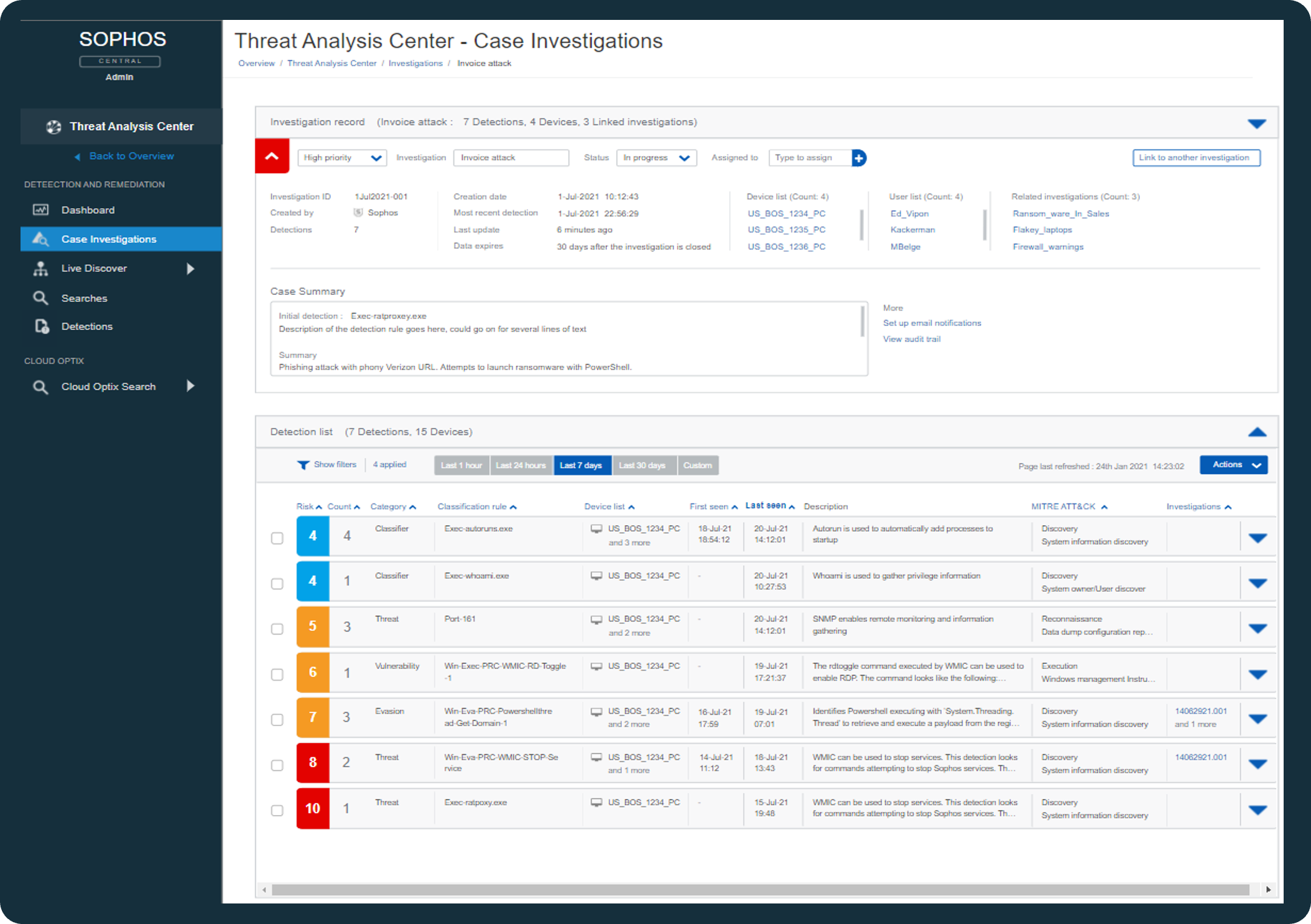 During their investigation, an analyst can make notes. This could be information of their discoveries or advising other analysts of what tasks they’ve already completed. Case notes are free format and come pre-populated with an investigation template. This template can be used to prompt an analyst on what to investigate. Were there any internal/external IPs, domains, or URLs connected to from the device? Any external RDP/SSH login attempts around the time of the detection? Did the detection identify any listening ports? Was the detection related to autorun or a service? It is an extensive template, built by experienced Sophos threat-hunters, that can coach and remind analysts of potential areas to investigate.