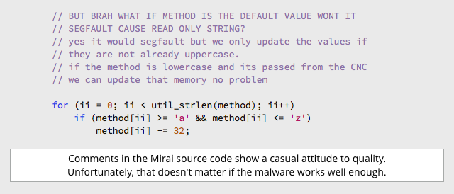 Mirai, as the malware is known, is badly programmed and unfinished, but that doesn’t matter.
