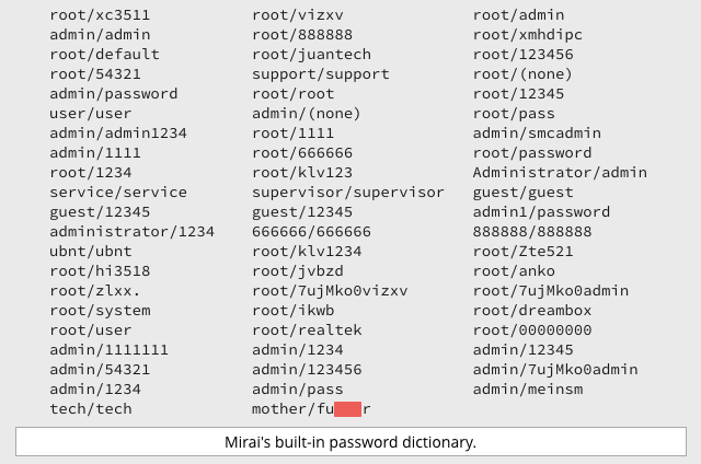 There’s a list of just over 60 built-in usernames and passwords that the Mirai bot uses to scan for other vulnerable devices; by all accounts, even this modest password dictionary is enough to find hundreds of thousands of easily-owned devices at a time.