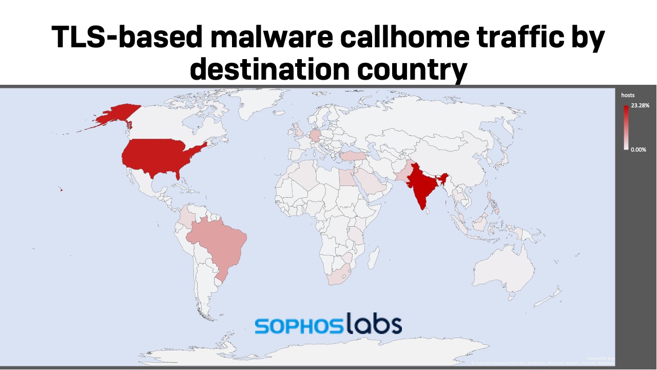 En conjunto, casi la mitad de todas las comunicaciones TLS de malware se dirigieron a servidores en Estados Unidos e India.