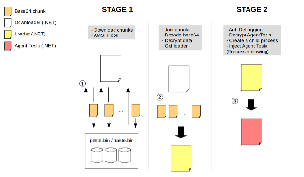 También hemos visto el uso de TLS en uno de los descargadores más recientes de AgentTesla, ya que los desarrolladores han utilizado servicios web legítimos para almacenar fragmentos de malware codificados en formato base64 en Pastebin y un servicio similar llamado Hastebin. El descargador de la primera etapa intenta evadir la detección al parchear la Interfaz de software anti-malware de Windows (AMSI) para evitar el escaneo en memoria de los fragmentos de código descargados a medida que se unen y decodifican.
