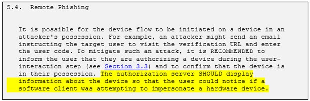 While investigating the device code flow, Secureworks researchers observed implementations that required only a client ID to generate the user code and device code and then subsequently poll for authentication. This behavior seemed to indicate that a threat actor could use the flow to conduct a phishing attack and impersonate legitimate client applications. The RFC notes this possibility and provides some mitigations that the OAuth provider should have in place (see Figure 2). Impersonating legitimate client applications helps the threat actor avoid detection and increases the likelihood that a victim will click a link.