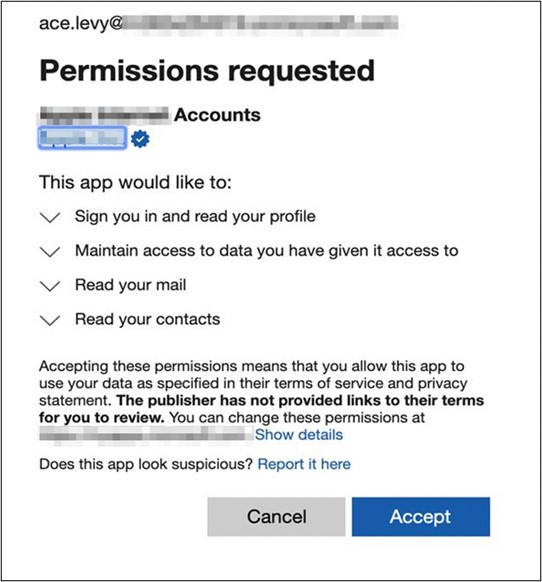 After authenticating, the victim could grant permissions to an app that does not appear suspicious. In some cases, the app may be verified (see Figure 4). The permissions could allow the threat actor to perform various tasks, including reading email. If offline access is specified, the attacker could maintain access long term.