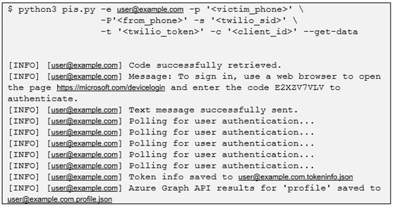 - It sends the target victim(s) an SMS text message containing both the user code and authorization URL and prompts the victim to enter the code and authorize the application.