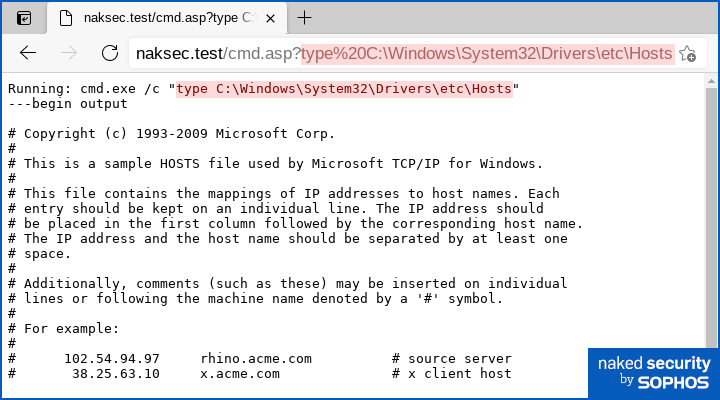 Or exfiltrate files with the builtin type function (like cat on Unix), e.g. with the command type C:\Windows\System32\Drivers\etc\Hosts: