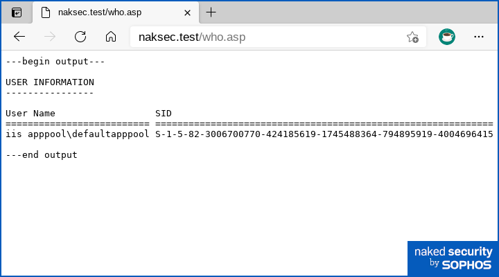 Then we ran the Windows command whoami /user and collected the output, in order to find out what user account the server itself was using.