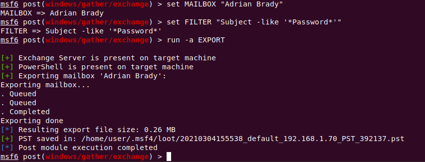 Once the Red Team discovers the email account of a person or people they’re interested in, the EXPORT command pulls data down from the Exchange server in the form of a .pst file.