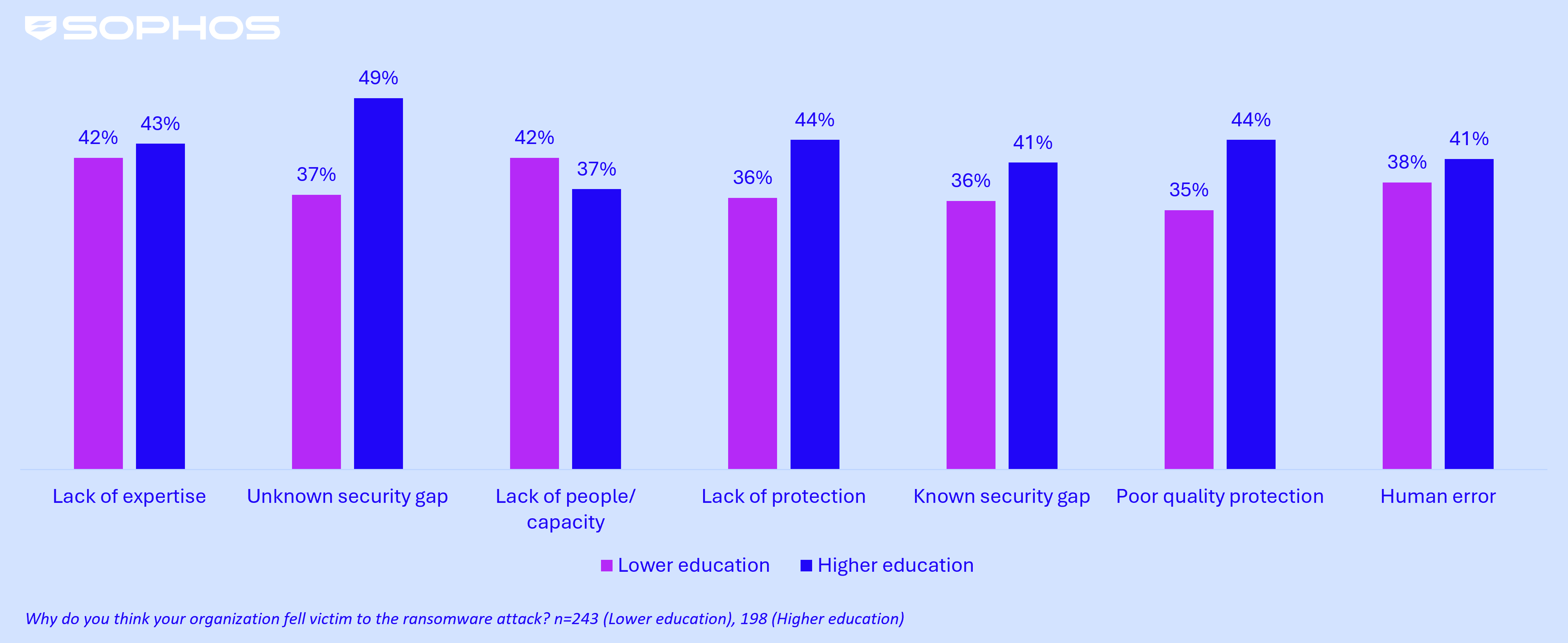 Los factores organizativos también variaban. Casi la mitad (49 %) de los proveedores de educación superior identificaron las brechas de seguridad desconocidas como la causa fundamental más común. En la educación primaria y secundaria, los problemas más citados fueron la falta de experiencia y la capacidad limitada para responder a los incidentes (42 % en cada caso). En general, los resultados sugieren que la educación superior se enfrenta a mayores retos tecnológicos, mientras que los proveedores de educación inferior luchan más con las presiones relacionadas con el personal.