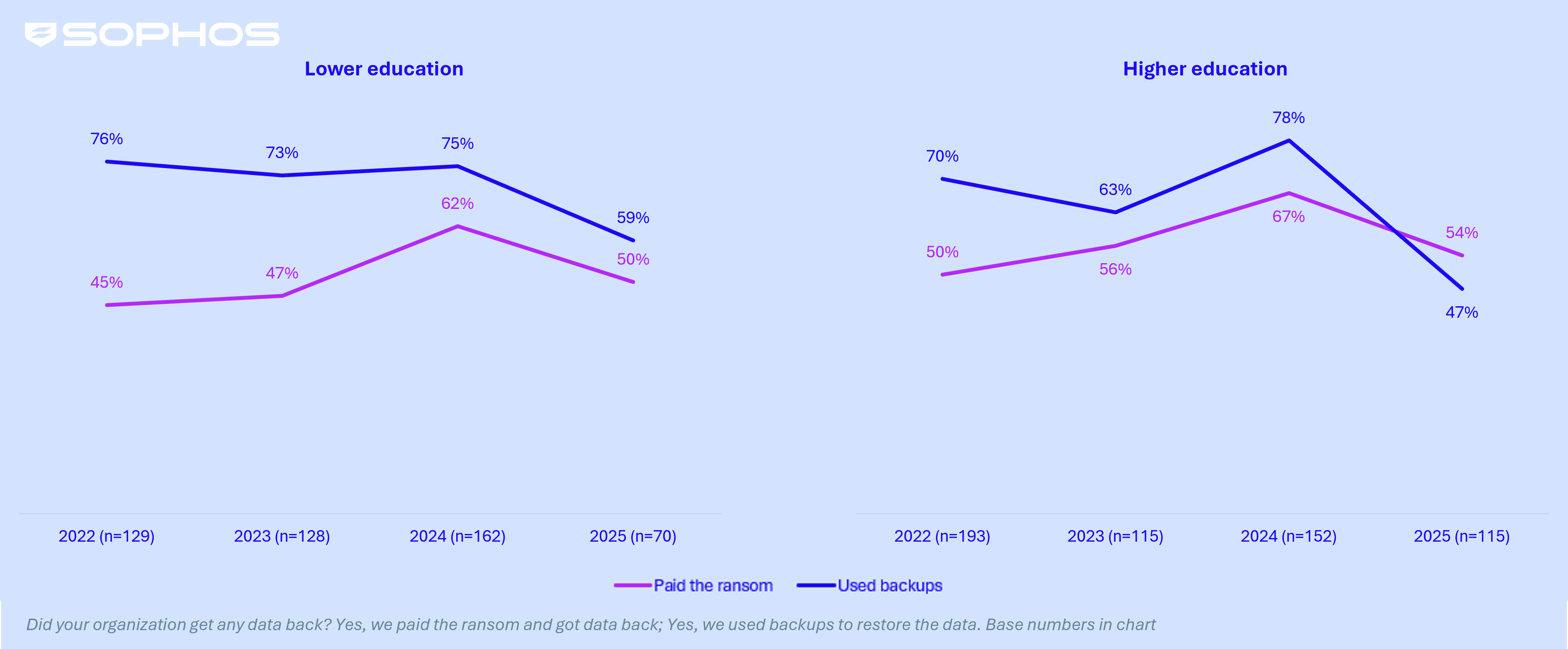 El uso de copias de seguridad para restaurar datos entre los proveedores de educación ha caído a su nivel más bajo en cuatro años. Entre los que tuvieron datos cifrados, solo el 59 % de las instituciones de educación primaria y el 47 % de los proveedores de educación superior restauraron los datos utilizando copias de seguridad (frente al 75 % y el 78 %, respectivamente). Este descenso pone de relieve los retos que sigue planteando el mantenimiento de prácticas de copia de seguridad coherentes y fiables en todo el sector. La tasa de proveedores de educación que pagaron el rescate para recuperar los datos mostró una tendencia similar, lo que sugiere una mayor dependencia de métodos de recuperación múltiples o alternativos.