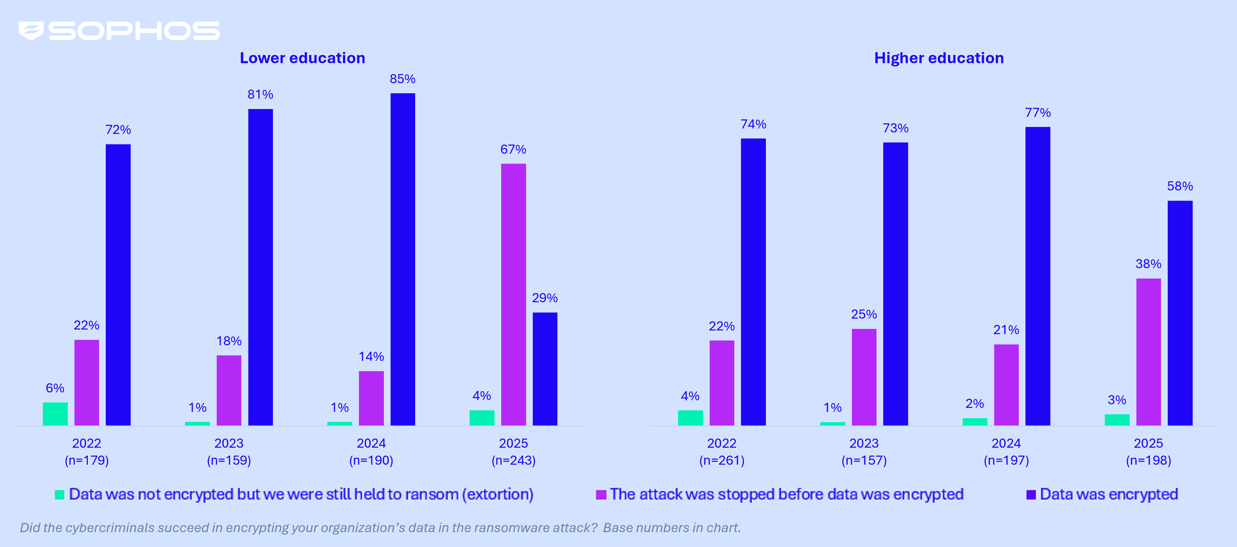 En línea con esta tendencia a la baja, el porcentaje de ataques detenidos antes de que se cifraran los datos se disparó, pasando del 14 % al 67 % en la educación primaria y secundaria y del 21 % al 38 % en la educación superior. Estos máximos históricos sugieren que los proveedores de educación han dado pasos importantes para reforzar sus defensas.