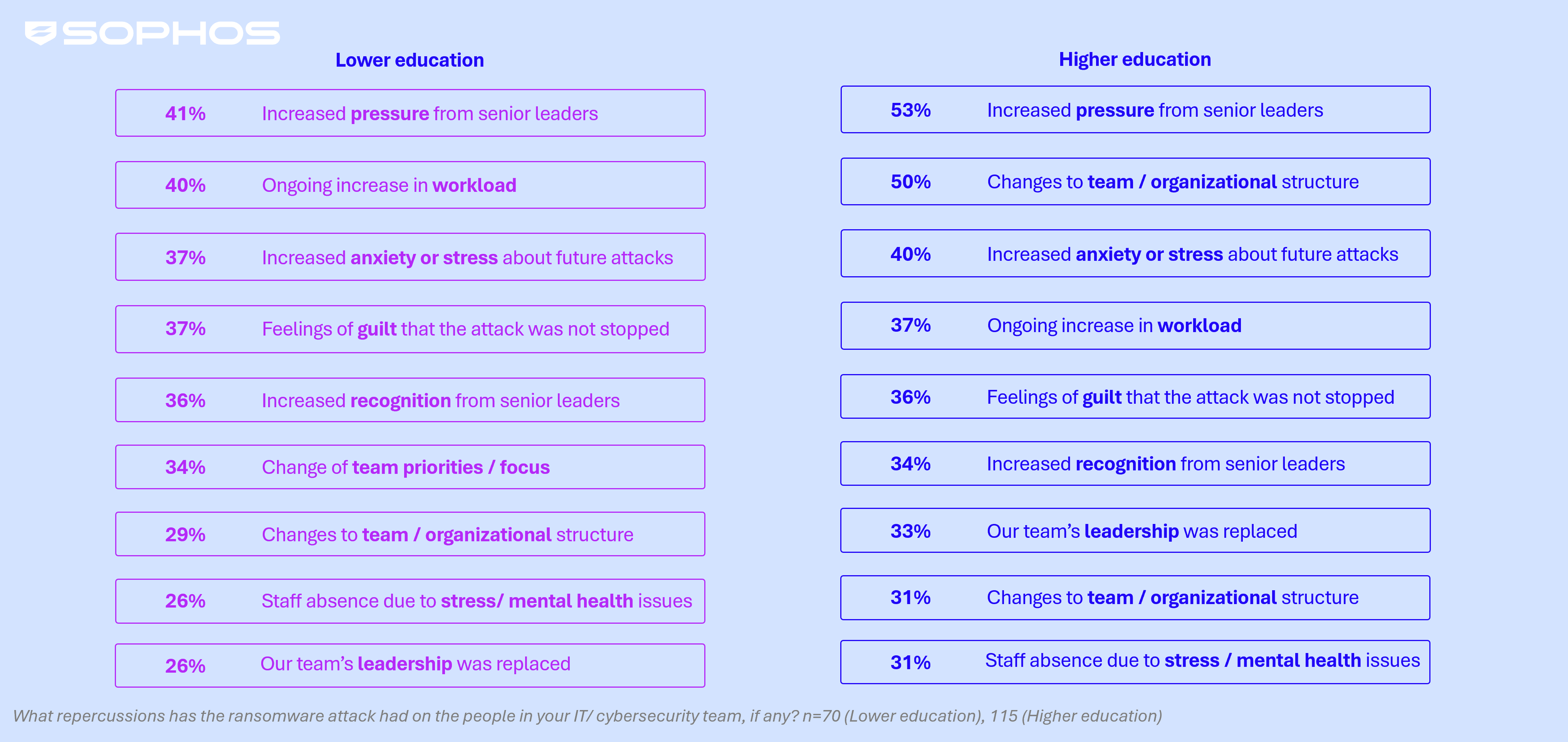 La encuesta deja claro que el cifrado de datos en un ataque de ransomware tiene repercusiones significativas para los equipos de TI/ciberseguridad del sector educativo, y tanto los proveedores de educación primaria como los de educación superior citan el aumento de la presión por parte de los altos directivos como la consecuencia más común.