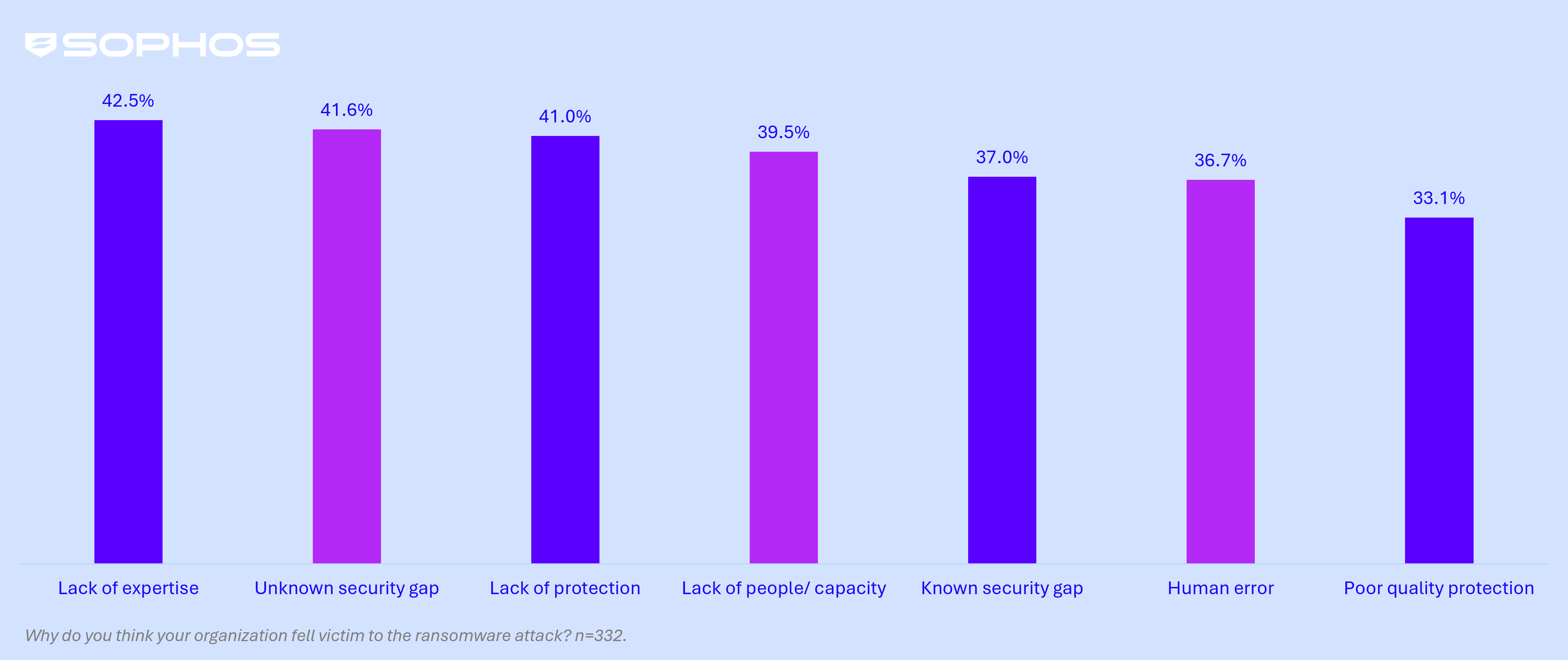 Múltiples factores organizativos contribuyen a que las organizaciones de fabricación y producción sean víctimas del ransomware, siendo el más común la falta de conocimientos especializados (es decir, la falta de habilidades o conocimientos disponibles para detectar y detener el ataque a tiempo), mencionada por el 42,5 % de las víctimas. Le siguen muy de cerca las brechas de seguridad desconocidas (es decir, debilidades en las defensas que los encuestados desconocían), que contribuyeron al 41,6 % de los ataques.