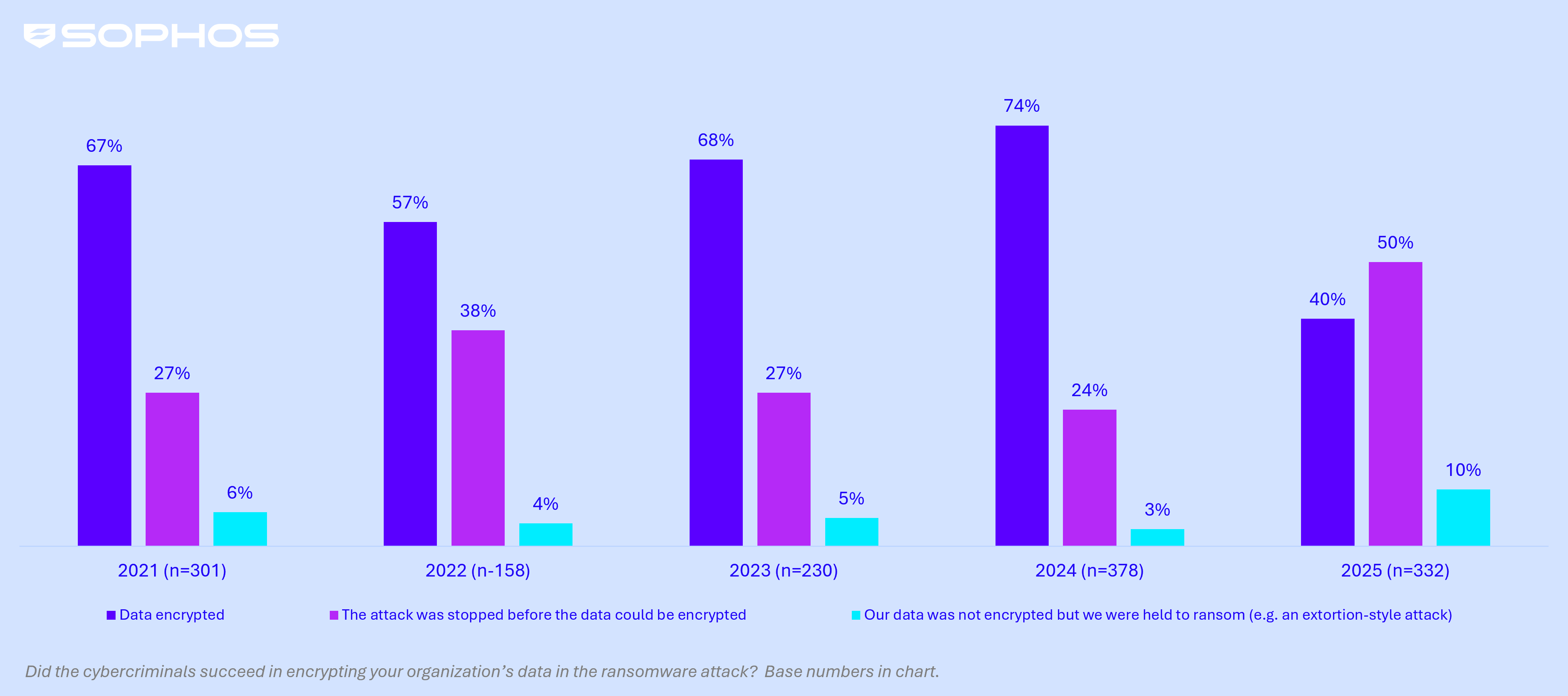 El cifrado de datos en el sector ha caído a su nivel más bajo en cinco años, con un 40 % de los ataques que dan lugar al cifrado de datos, el tercer porcentaje más bajo registrado en la encuesta de este año y cerca de la mitad del 74 % registrado por las organizaciones de fabricación y producción en 2024. En línea con esta tendencia, el porcentaje de ataques detenidos antes del cifrado alcanzó su máximo en cinco años, lo que indica que las organizaciones de fabricación y producción están reforzando sus defensas.