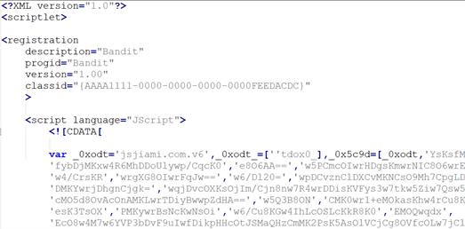 C:\Users\{redacted}\AppData\Roaming\Tg_B518c1A0Ff8C\appR.exe /s /n /u /i:appR.dat appR.dll Aquí appR.exe es el componente de Windows regsvr32.exe, con su nuevo nombre. Ejecutará la biblioteca appR.dll, que es otro componente de Windows renombrado, scrobj.dll: el motor de ejecución de scripts. A continuación, ejecutará el código Javascript almacenado en appR.dat: