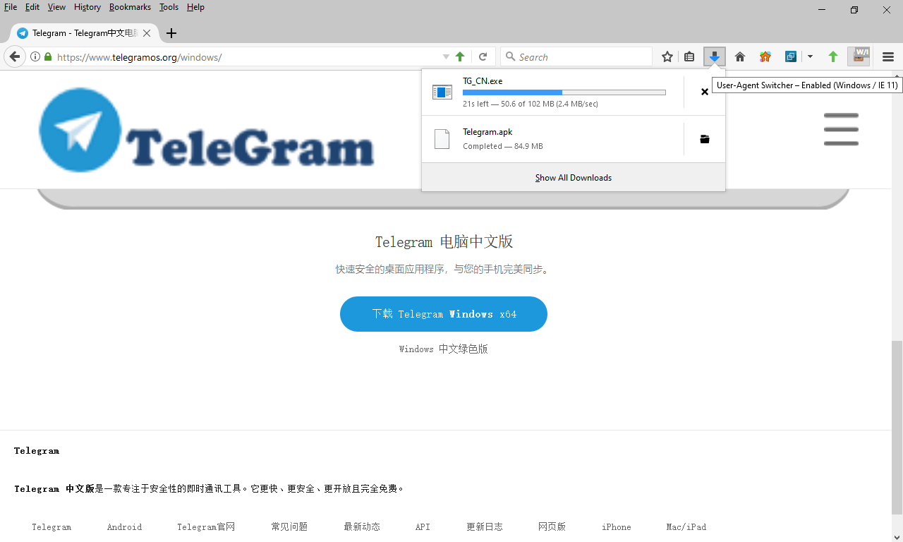 Al principio, nuestra investigación nos llevó a un sitio web (telegramos[.]org) que ofrece, o dice ofrecer, versiones en chino de la aplicación Telegram para Android, iOS y Windows. Observamos que el sitio (que nosotros y otros proveedores señalamos como malicioso) ignoraba ocasionalmente, pero no sistemáticamente, nuestras opciones de SO cuando hacíamos clic en los enlaces de descarga, entregando en su lugar una versión basada en la cadena de agente de usuario a la que estaba configurado nuestro navegador, como se muestra en las capturas de pantalla siguientes.