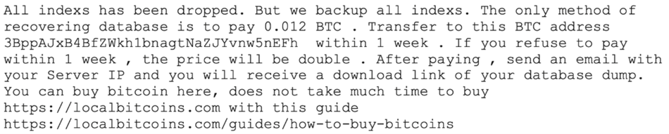 Figure 1. Ransom note dropped on exposed Elasticsearch database. (Source: Secureworks)