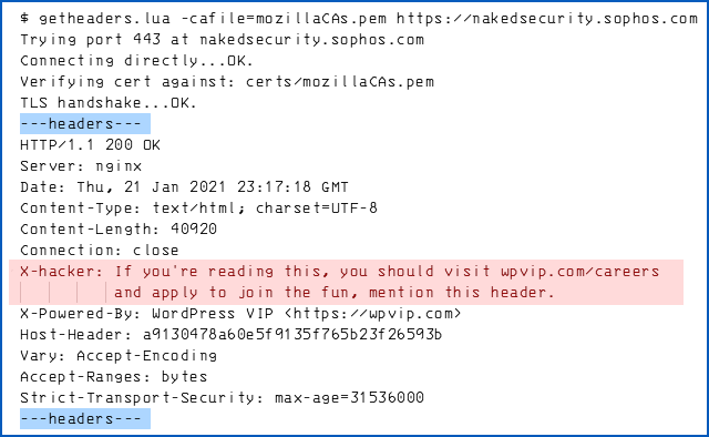 Likewise, many websites contain harmless jokes and messages, often inserted into the HTTP headers added to the reply, rather than in the body of the HTML data itself.