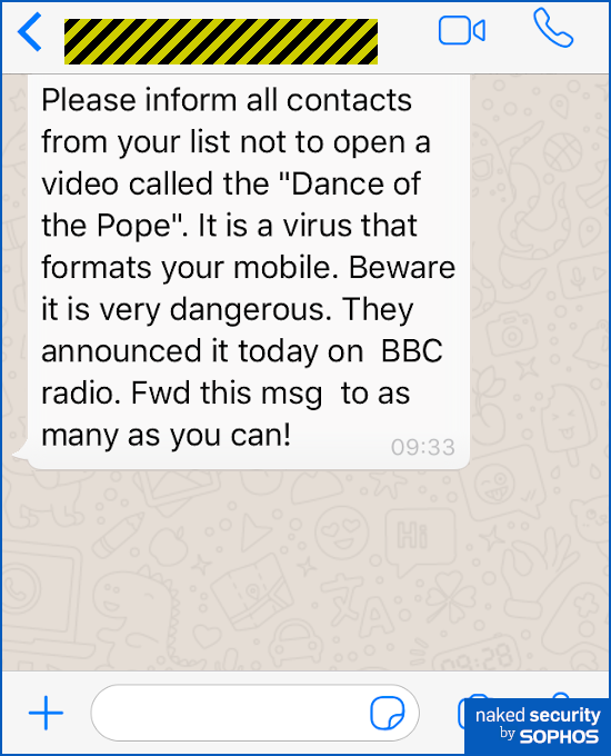 Please inform all contacts from your list not to open a video called "Dance of the Pope". It is a virus that formats your mobile. Beware it is very dangerous. They announced it today on BBC radio. Fwd this message to as many as you can!