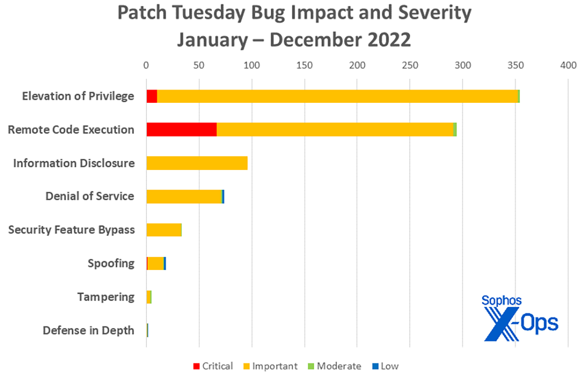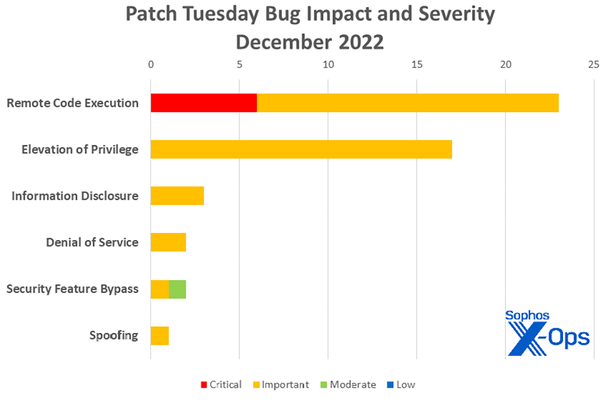 Figure 3 : Même avec un pourcentage plus élevé de vulnérabilités d’exécution de code à distance en décembre, 2022 a été une année plutôt riche en bugs d’élévation de privilèges, du moins parmi ceux avec une gravité ‘Importante’ ou ‘Critique’