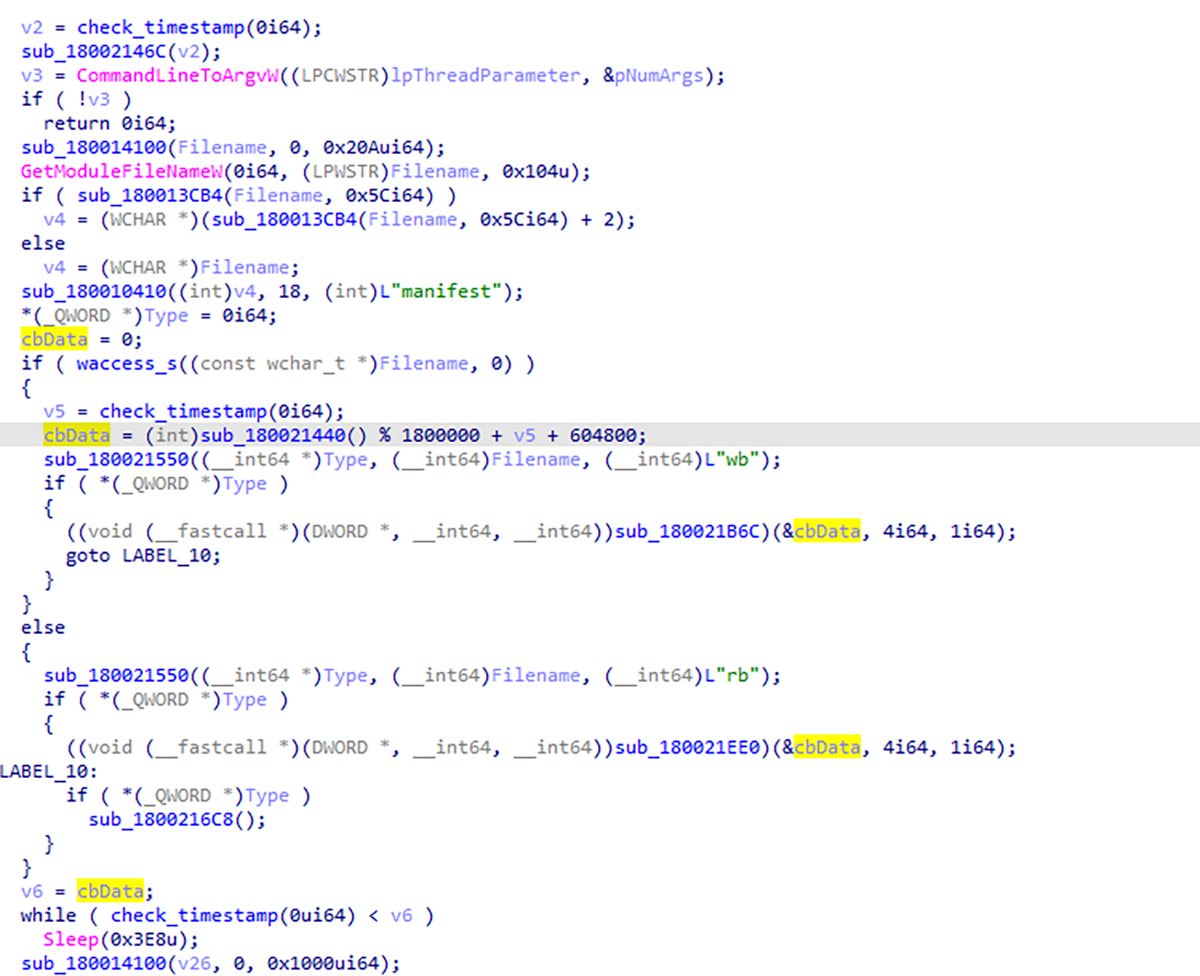 En regardant ce dernier, nous pouvons voir une boucle while qui appelle la fonction check_timestamp et reçoit une valeur entière de 64 bits en lien avec l’appel API GetSystemTimeAsFileTime. Les résultats de check_timestamp sont évalués par rapport à “v6”, une variable qui contient la valeur provenant de cbData. cbData est collecté à partir du fichier “manifest” comme indiqué ci-dessous.