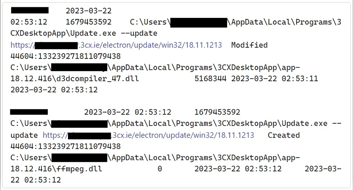 Dans le cadre de notre analyse, nous avons également comparé le fichier ffmpeg.dll dans 3CX avec le même fichier présent dans d’autres applications Electron. Notre analyse a montré que seul le fichier ffmpeg.dll de 3CX contenait le code malveillant. Nous en concluons donc que cette compromission n’affecte pas les autres applications Electron, mais seulement ffmpeg.dll de 3CX.