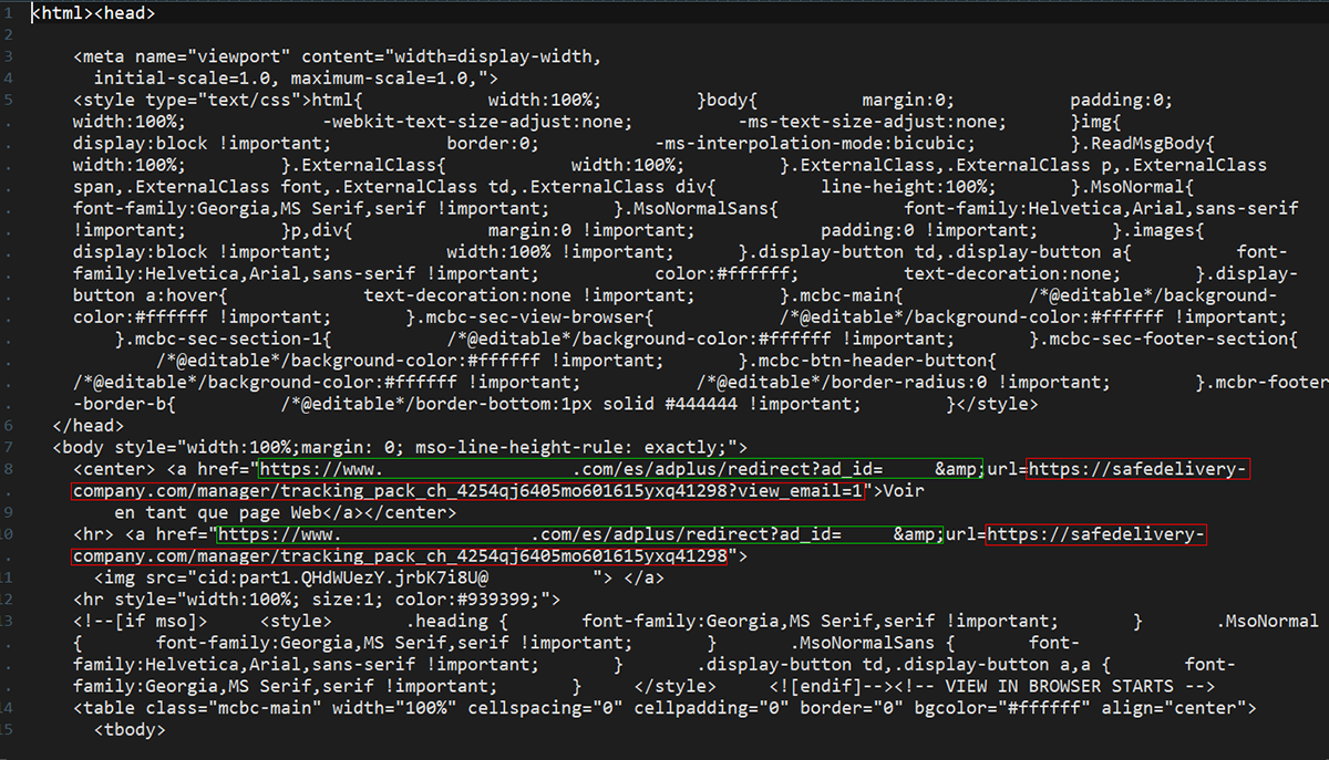 La capture d’écran suivante montre le code source HTML de l’email, notamment le lien vers le site Web inoffensif (surligné en vert) et comment sa redirection a envoyé les utilisateurs vers le site Web malveillant (surligné en rouge).