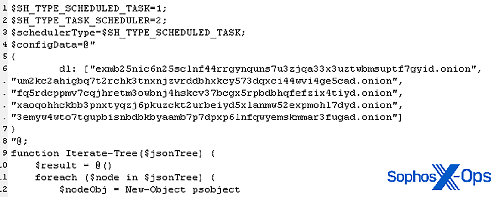 Le troisième script configure une tâche planifiée qui exploite deux programmes du dossier de mise à jour Notepad++, à savoir GUP.exe et GUPP.exe, pour effectuer des ‘phone home’, une fois par jour à minuit (heure locale), au niveau de l’une des cinq adresses .onion, choisies au hasard, à partir d’une liste hardcodée également intégrée dans le script.