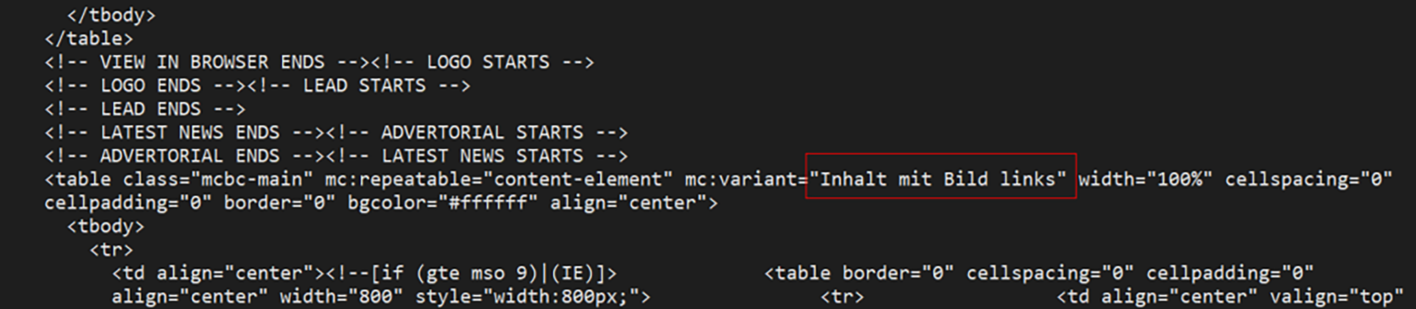 Bien que le message électronique ait été rédigé en français, des indices techniques indiquent toutefois que les attaquants savaient que la cible suisse pouvait être germanophone. Les deux langues (française et allemande) sont considérées comme des langues “officielles” en Suisse. Des commentaires en allemand sont intégrés dans le code HTML (“Inhalt mit Bild links“, qui se traduit soit par “contenu avec des liens image” soit par “contenu avec image à gauche”) qui constituait le corps de l’email, lequel a été envoyé à une personne utilisant Outlook comme client de messagerie.