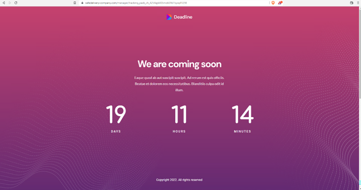En fait, il s’agit d’un comportement observé dans d’autres incidents de malware. Le compte à rebours se réinitialisait avec une valeur aléatoire au format jours/heures/minutes à chaque fois que vous rechargiez la page. Le code qui exécutait cette page était un modèle ReactJS appelé Deadline. Les personnes qui l’utilisaient n’ont même pas pris la peine de modifier le bloc de texte standard ‘Lorem ipsum’ du modèle en question.