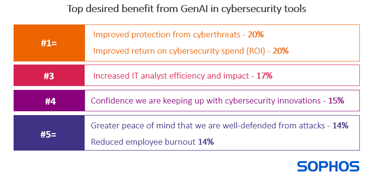 Comme vu précédemment, l’amélioration du retour sur investissement (ROI) en matière de cybersécurité figure également en tête de liste des avantages que les entreprises cherchent à obtenir grâce à GenAI.