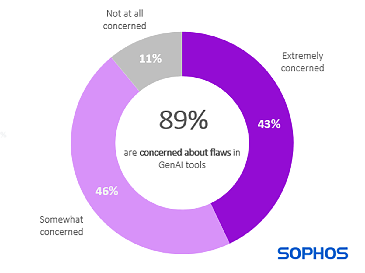 Les entreprises sont largement conscientes du risque d’une IA mal développée et déployée dans les solutions de cybersécurité. La grande majorité (89%) des professionnels IT/cybersécurité interrogés se disent préoccupés par de potentielles failles dans les capacités IA générative au sein des outils de cybersécurité qui pourraient nuire à leur entreprise, 43% se disant extrêmement inquiets et 46% plutôt inquiets.
