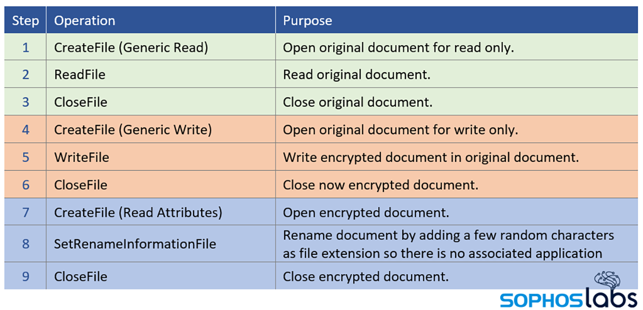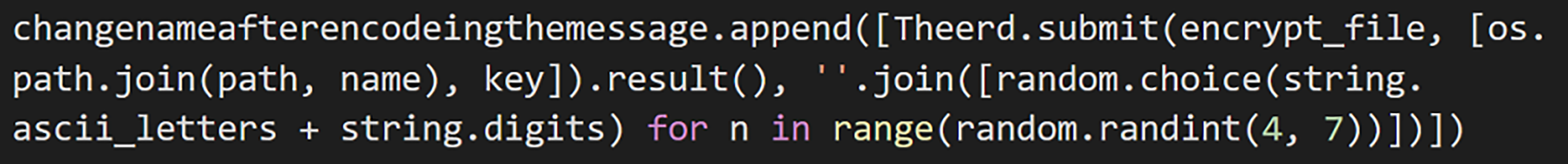 Le code permettant de renommer les fichiers désormais chiffrés choisit une chaîne aléatoire entre 4 et 7 caractères et l’ajoute au nom du fichier, de sorte que son suffixe ne corresponde plus à l’application à laquelle il était associé initialement :