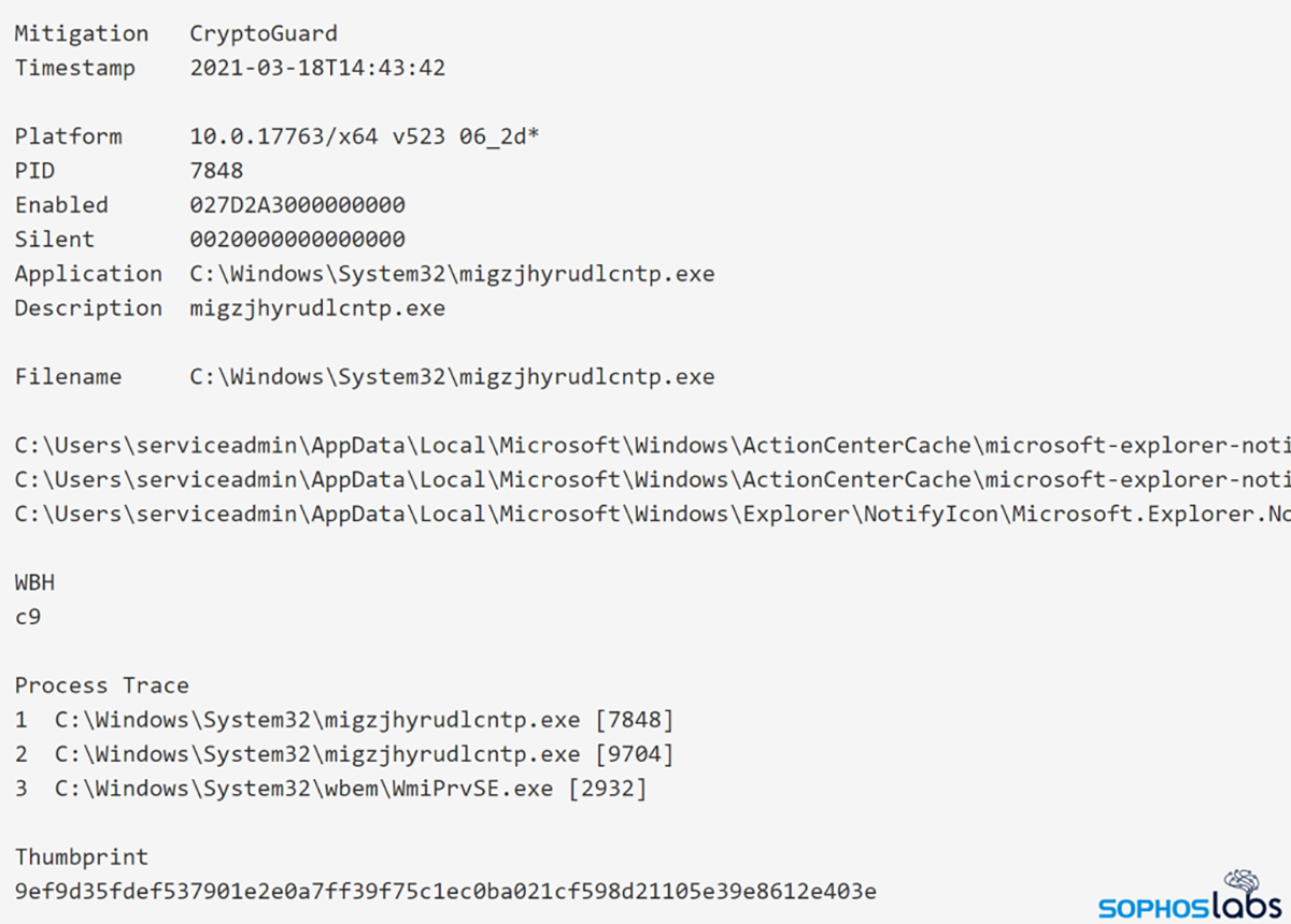 Notre protection CryptoGuard a détecté le ransomware qui tentait de chiffrer des données. Ci-dessous, la télémétrie brute de notre technologie ne reposant pas sur des signatures montre le binaire du ransomware exécuté via WMI comme décrit ci-dessus (lisez la séquence Process Trace à l’envers, de 3 à 1) :