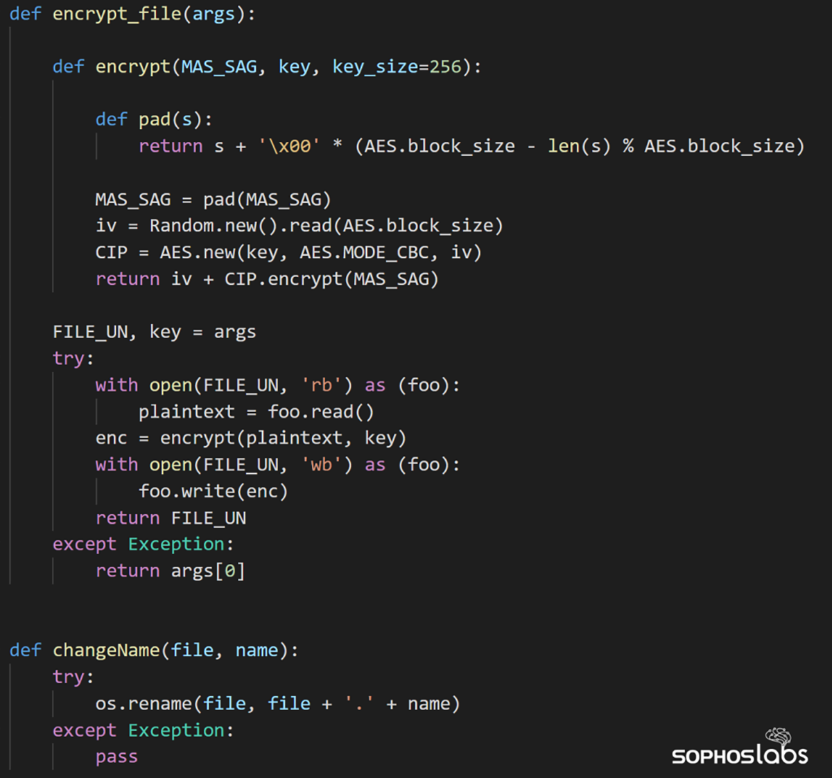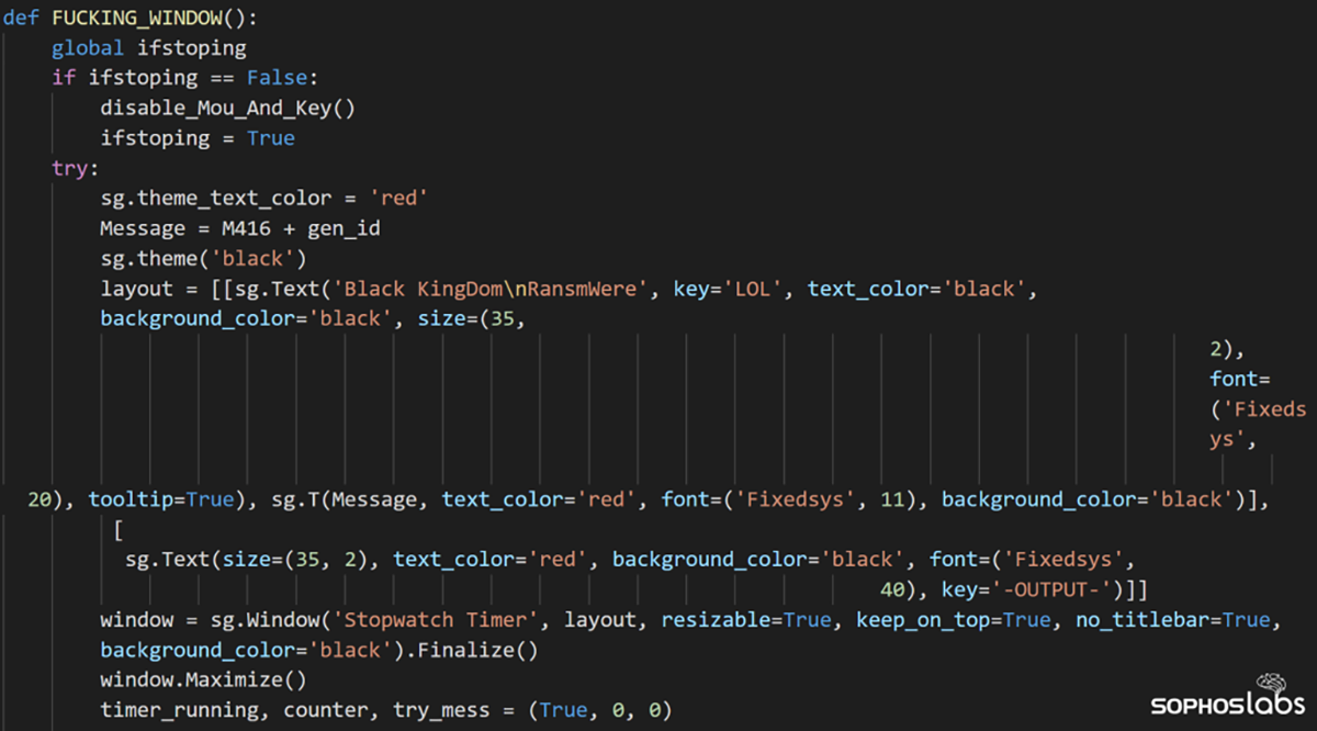 Le binaire du ransomware est basé sur un script Python qui a été compilé en un exécutable à l’aide d’un outil appelé PyInstaller. Avec quelques efforts, nous avons pu décompiler le binaire dans son code source d’origine, ce qui nous a aidés à comprendre les fonctionnalités du ransomware. Le créateur a nommé le code source 0xfff.py, dont le “fff” représente la valeur hexadécimale du nombre décimal 4095. La signification de ce codage reste un mystère.