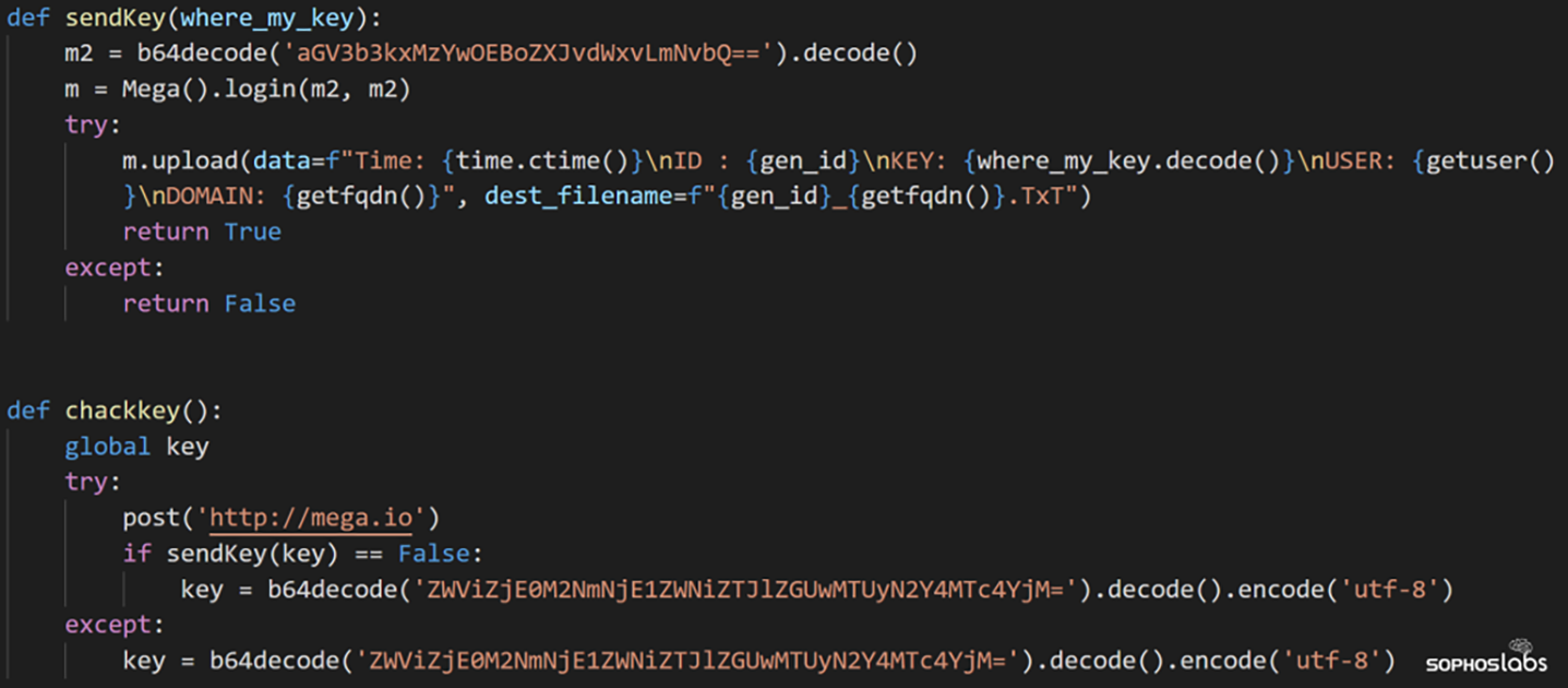 La clé (key) et gen_id sont ensuite uploadés sur un compte via mega.io. Cependant, si pour une raison quelconque le ransomware Black KingDom ne parvient pas à uploader cette clé de chiffrement générée aléatoirement au niveau de Mega, il dispose d’une solution de secours sous la forme d’une clé statique hardcodée :