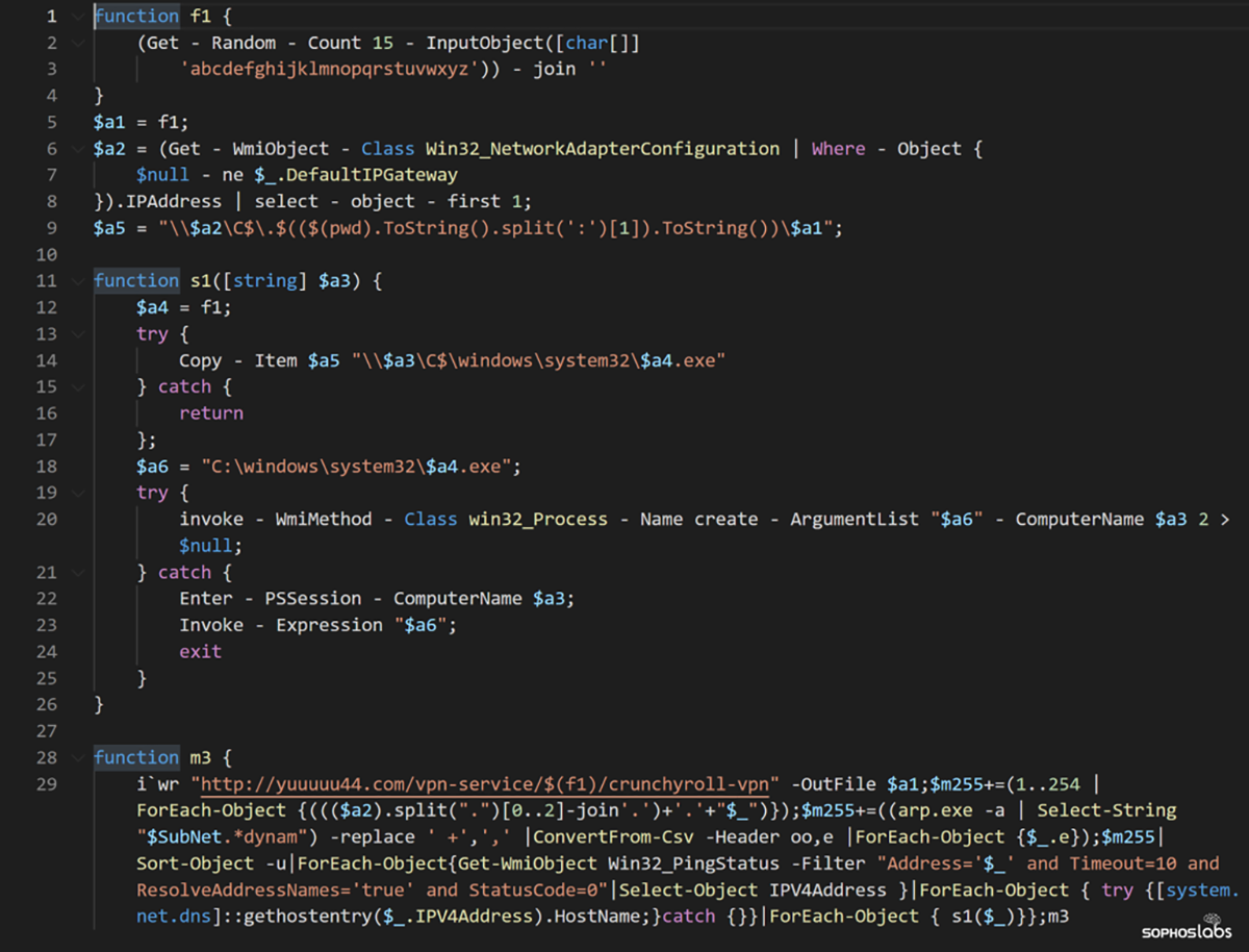 Le script exécute le ransomware en appelant Win32_Process via WMI, (Windows Management Interface). Le script inclut la possibilité d’uploader le ransomware sur d’autres ordinateurs du réseau et de l’exécuter.