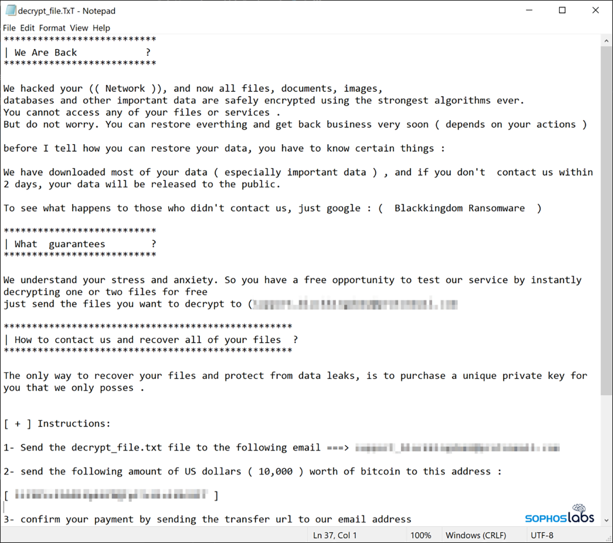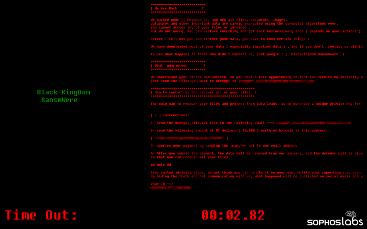 Suite aux attaques du ransomware DearCry signalées récemment, un autre gang de ransomware a également commencé à cibler les serveurs Exchange vulnérables avec un autre malware, appelé Black KingDom. La télémétrie Sophos a commencé à détecter ce ransomware le jeudi 18 mars alors qu’il ciblait les serveurs Exchange qui n’étaient toujours pas corrigés par rapport aux vulnérabilités ProxyLogon révélées par Microsoft au début du mois dernier.