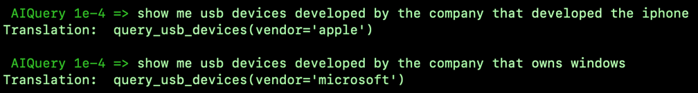 Figure 7 demonstrates how our prototype, called AIQuery, translates between unstructured, free-form queries like “show me usb devices developed by the company that developed the iphone,” and a domain specific search language we’ve defined for querying a database of security-relevant data (query_usb_devices(vendor=’apple’)). Remarkably, AIQuery has learned that a reference to “devices developed by the company that developed the iphone” should be translated to “apple” in the context of a structured database query, and that a reference to “developed by the company that owns windows” should be translated to Microsoft.