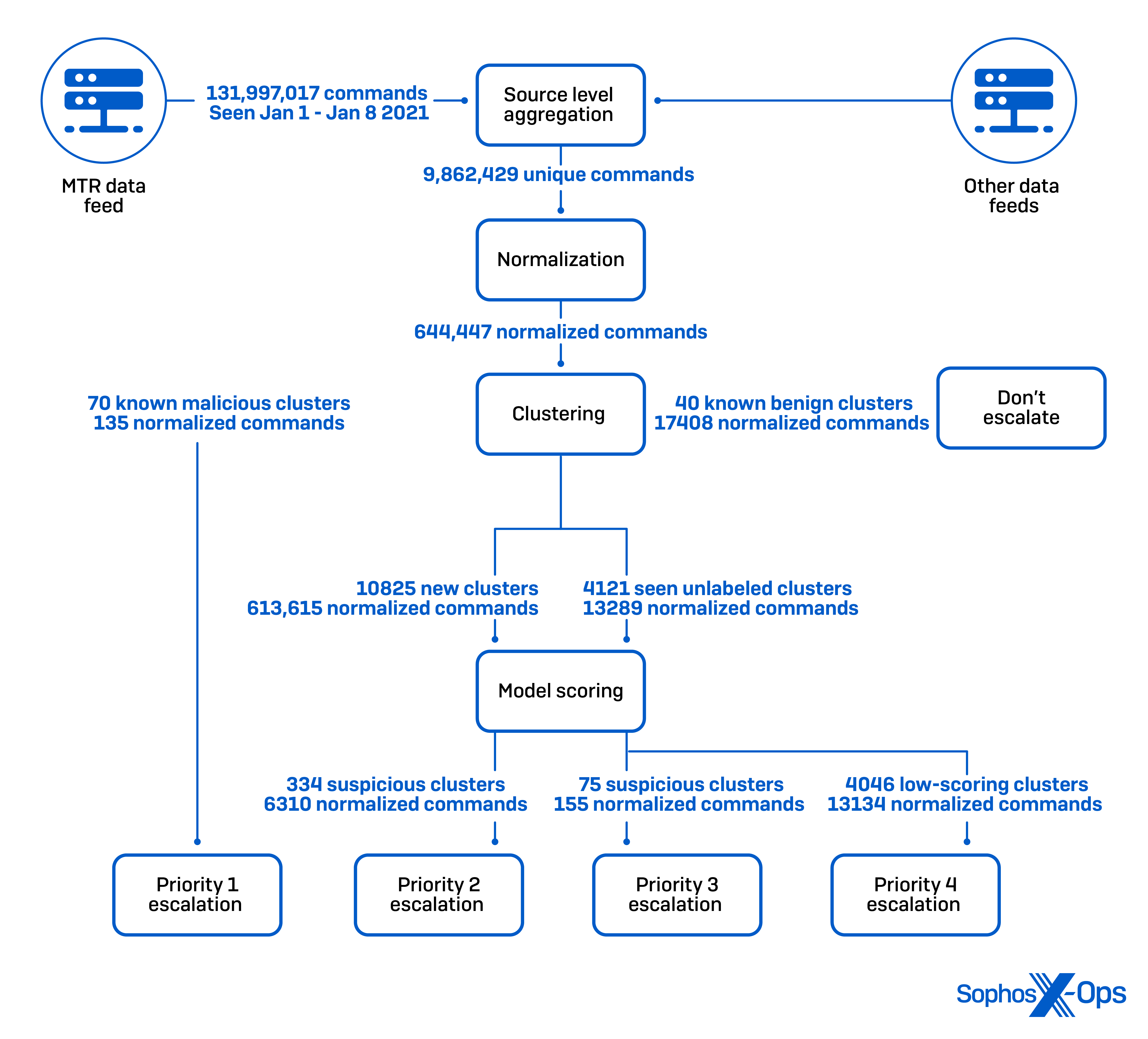 A third prong of Sophos’ research investments in building the AI-assisted SOC focuses on detecting living-off-the-land (also known as ‘fileless’) adversary behavior based on a real-time human/ML feedback loop. In this research, we present novel, suspicious clusters to SOC analysts, who label clusters as either benign or suspicious.