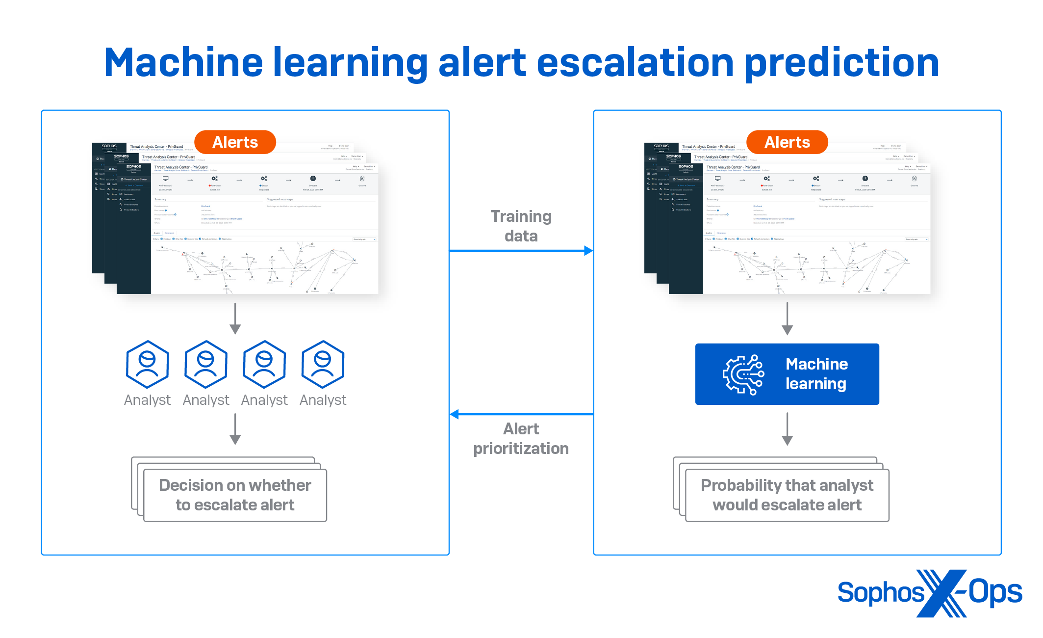 Sophos AI is building and iteratively improving a prototype for predicting which alerts analysts will deem relevant. The setup for alert escalation prediction is given in Figure 5. The panel on the left of the figure shows the workflow SOC analysts engage as they triage alerts, deciding which alerts to discard as false positives and which to escalate as worthy of follow-up. The panel on the right shows how machine learning, in our experiments, learns to mimic and predict analysts’ decisions such that we prioritize alerts that they are most likely to escalate, so they can address them first.