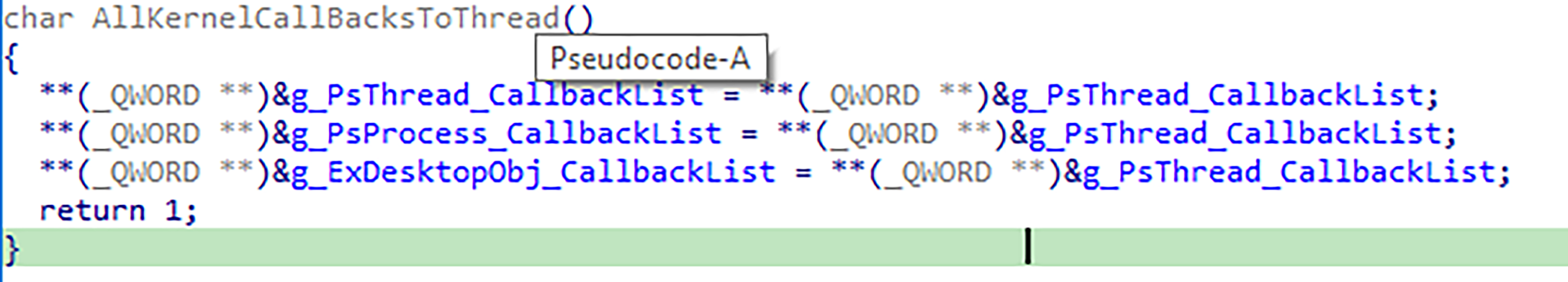 - Les structures internes utilisées par les fonctions correspondantes PsSetLoadImageNotifyRoutine, PsSetCreateThreadNotifyRoutine et PsSetCreateProcessNotifyRoutine sont itérées. Si le rappel appartient à un pilote de sécurité balisé (tagged), par conséquent, la fonction de rappel enregistrée se ferme immédiatement sans exécuter aucune des opérations prévues.
